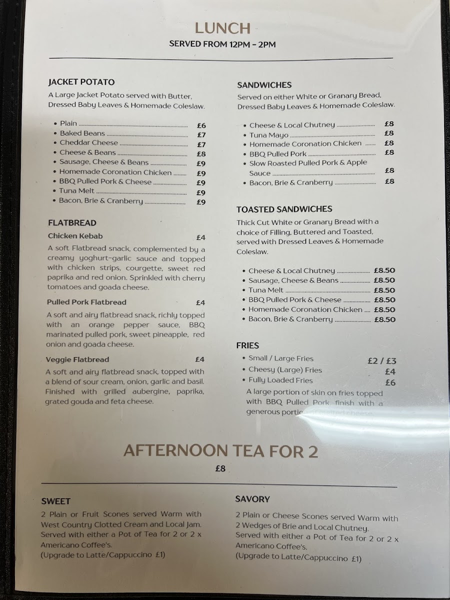 - Sandwiches: A selection of sandwiches is available, including cheese with local chutney, tuna mayo, homemade coronation chicken, and BBQ pulled pork. Prices vary, with some options listed at £8.00.